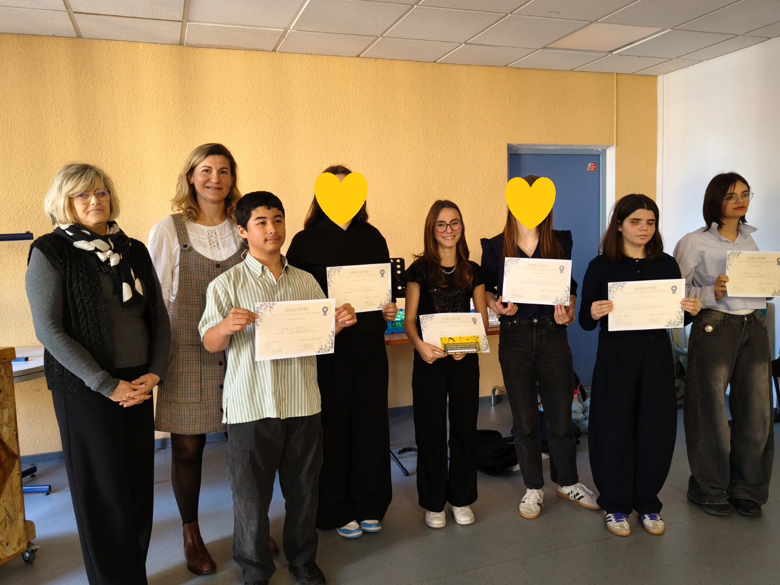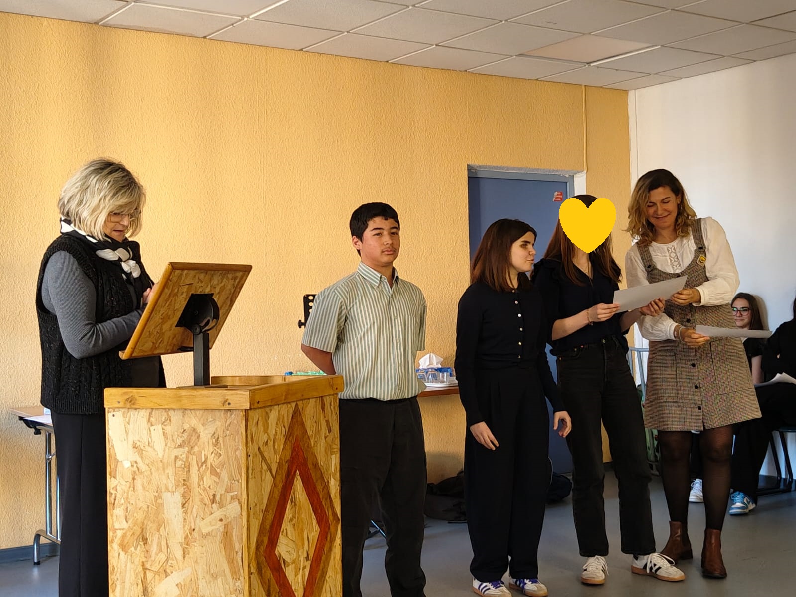 Matteo, sur « Ah, c’était mieux avant !», est arrivé 3ème. Il a été devancé par Juliette E.S. avec son discours « La plume est-elle plus forte que l’épée ? » et Juliette M. qui a discouru sur « Sommes-nous des copies qu’on forme ? ». Le jury n’a pas réussi à départager ces deux brillantes élèves qui sont donc arrivées 1ères ex-aequo.